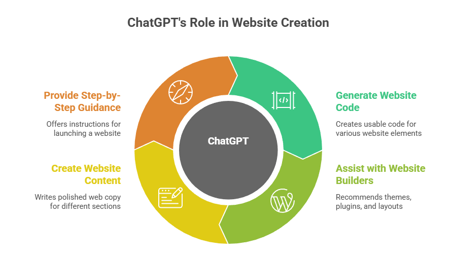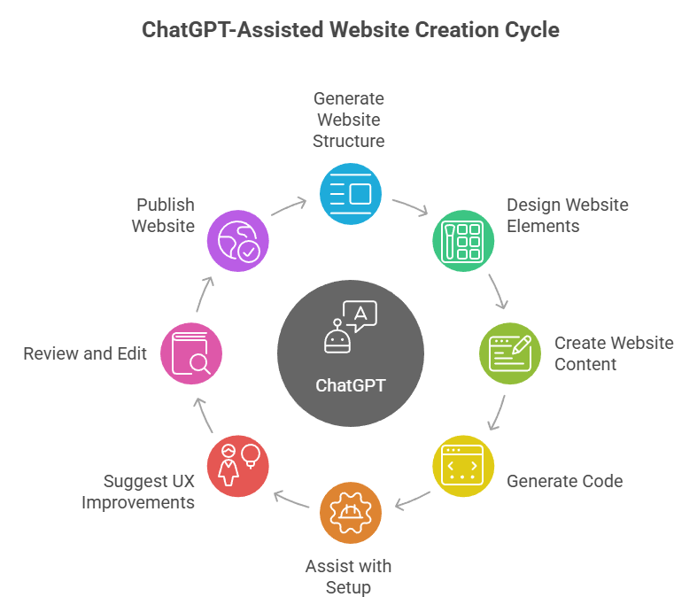 ChatGPT is especially useful for creating website layouts and page structures, writing website copy and SEO content, generating HTML, CSS, and JavaScript, assisting with WordPress or Shopify setup, and suggesting UX design ideas and improvements. These capabilities dramatically reduce development time while helping beginners and professionals maintain creativity and structure. Even so, every output benefits from human review, editing, and publishing before going live.