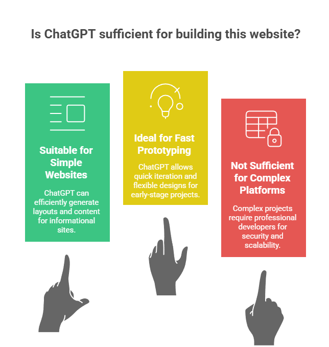 This section explains the types of projects where ChatGPT provides sufficient support to create a functional and effective website without requiring advanced technical development. The goal is to clarify the boundary between simple websites that AI can help produce efficiently and complex platforms that still require professional engineering expertise. By understanding these distinctions, users can make informed decisions about when to rely on ChatGPT and when to involve a developer.
