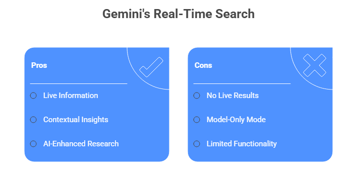 Gemini’s real-time capabilities are constrained by configuration settings, product boundaries, and regional or platform-specific browsing permissions. It cannot guarantee universal availability of live access, and the reliability of retrieved information may vary depending on the quality of the source content being accessed.