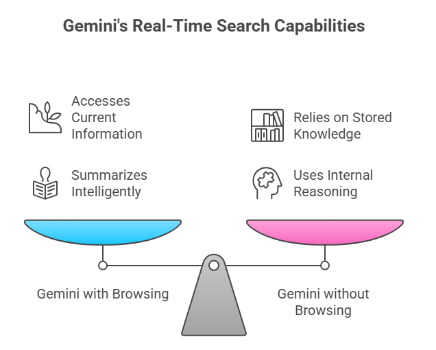 The reality is more nuanced because Gemini is not fundamentally a search engine, but rather an AI system capable of interacting with search data under certain conditions. In environments where browsing or integrated tools are enabled, Gemini can work with current information and summarize it intelligently, which gives the impression of real-time search functionality. However, without those capabilities turned on, Gemini draws only from internal knowledge and stored patterns instead of actively fetching new information.