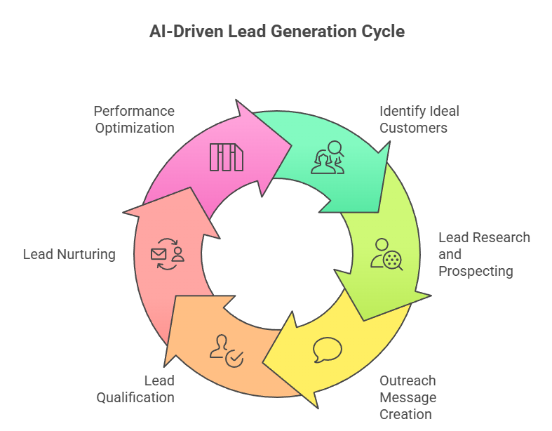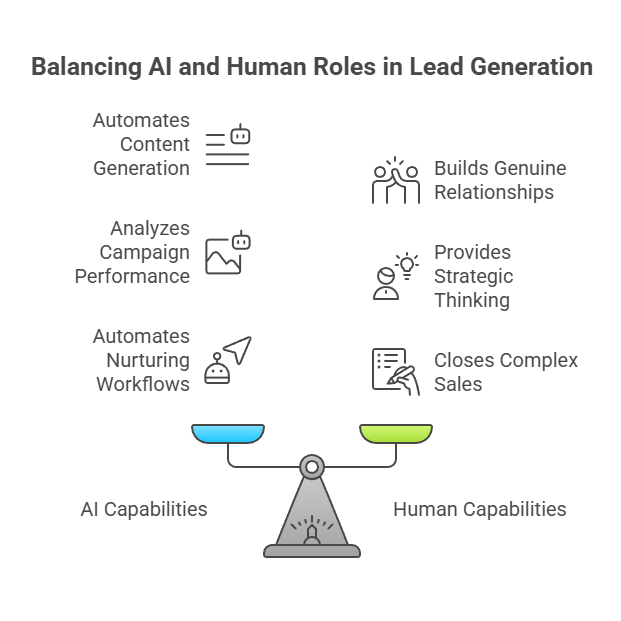 AI acts as an intelligent support system that manages repetitive, data-heavy tasks such as research, messaging, and lead scoring. This allows sales and marketing teams to focus on strategy, relationship-building, and closing higher-value opportunities. The result is a more scalable and cost-effective lead generation process.