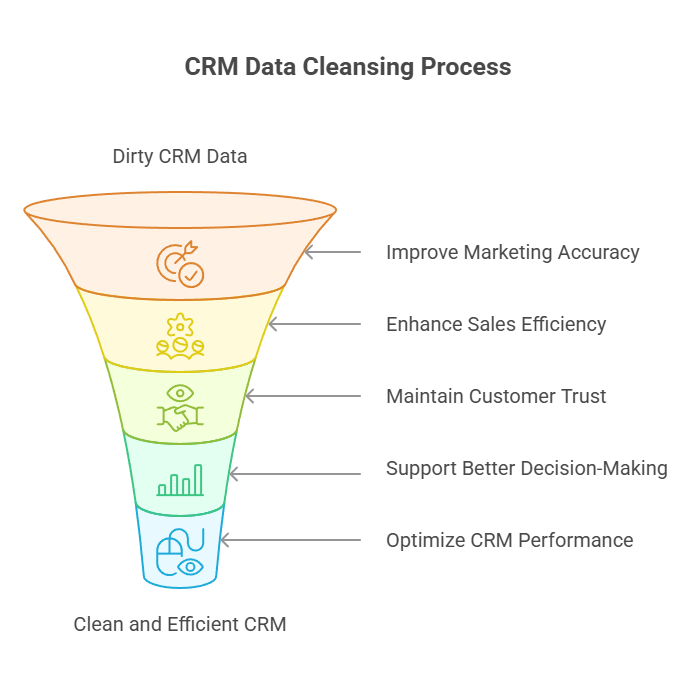 Large volumes of duplicate or outdated records can slow down CRM systems. Data cleansing keeps the CRM organized, fast, and responsive.