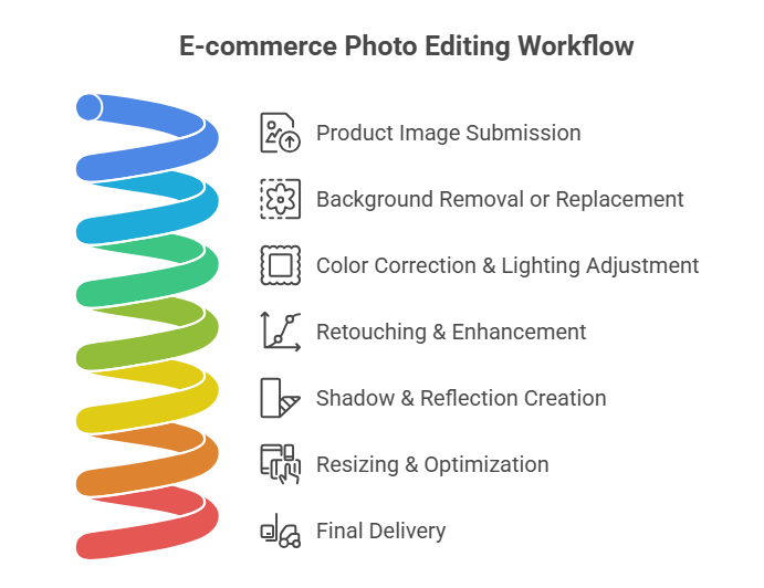 Before understanding how product photo editing benefits online businesses, it’s important to know how the process works step-by-step. Each stage of the editing workflow is designed to refine the product visuals until they reach marketplace-standard quality. The process ensures consistency, accuracy, and visual appeal for every image uploaded to your online store or e-commerce marketplace.