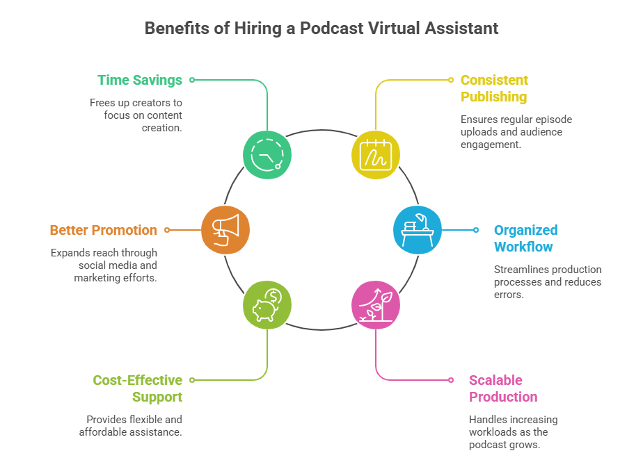 One of the main advantages is efficiency. Delegating editing coordination, publishing tasks, and scheduling allows hosts to focus on recording and content development. This demonstrates how a podcast VA saves time for busy podcasters who want to prioritize creativity over administration.