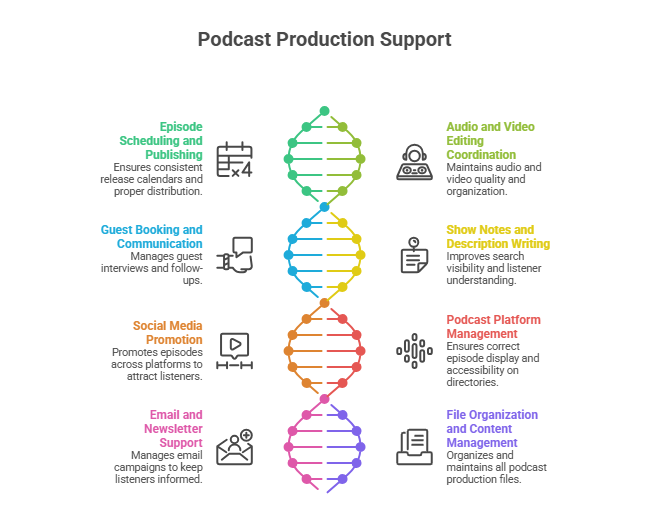 Many creators rely on a podcast production virtual assistant to prepare episode summaries, detailed show notes, and keyword-optimized descriptions. These written assets improve search visibility and help listeners understand the episode content quickly. Well-structured show notes can also be repurposed into blog posts or newsletter content.