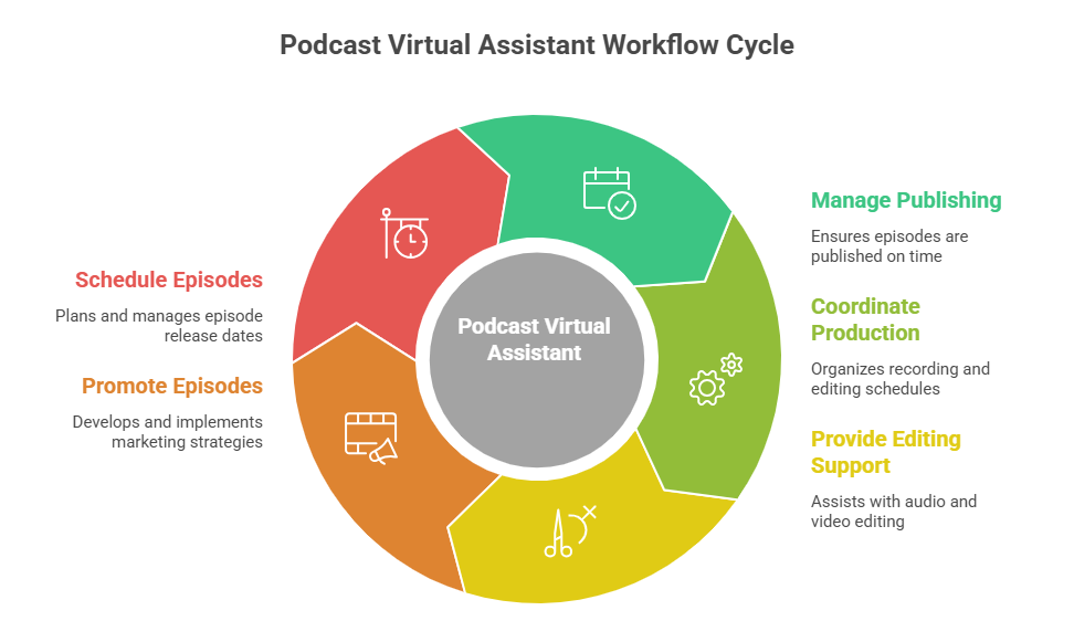 A podcast VA is a remote professional who supports podcasters with editing coordination, scheduling, publishing, promotion, and production management.