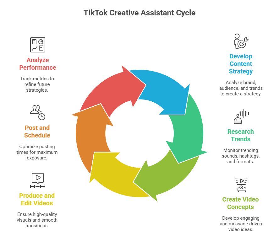 A TikTok Creative Assistant operates strategically across multiple stages of content creation and management. The process ensures that every video aligns with your goals, speaks to your audience, and leverages current TikTok trends. Below is a breakdown of how they turn ideas into engaging, viral-ready videos.