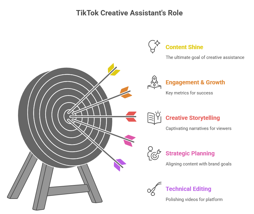 They help brands, influencers, and marketers increase visibility, engagement, and follower growth. By combining creative storytelling, strategic planning, and technical editing, they make sure every video aligns with your brand message while tapping into current TikTok trends. In short, a TikTok Creative Assistant bridges creativity and data to make your content shine.