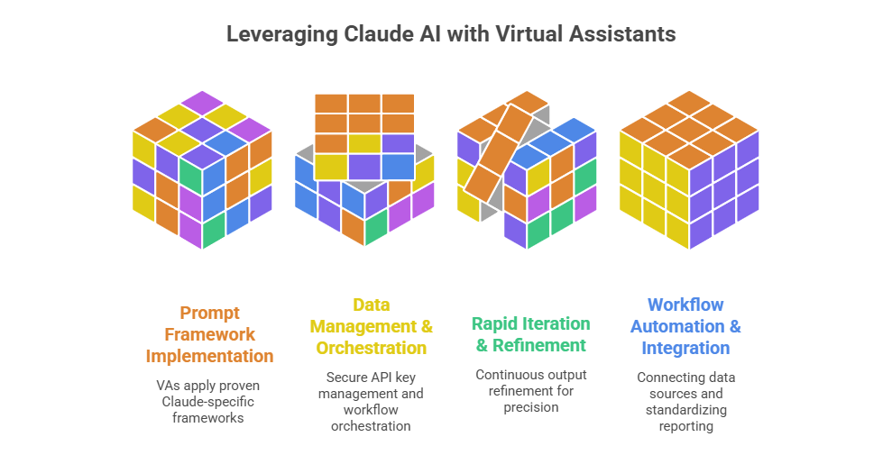 Beyond execution, VAs implement workflow automation, connect data sources across tools, and standardize reporting formats for scalability. They maintain audit-ready documentation, enforce data governance practices, and ensure compliance with security and privacy requirements while monitoring output quality and applying human oversight. This enables businesses to fully leverage Claude AI’s capabilities without building in-house expertise, while maintaining control, transparency, and operational efficiency at scale.