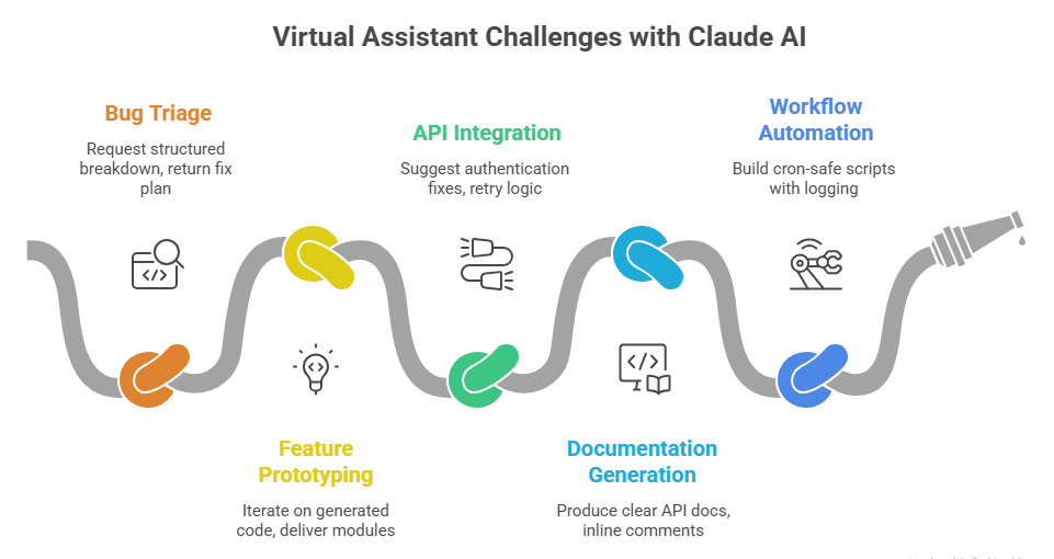 Virtual assistants combine Claude with GitHub for version control and pull-request reviews, Jira or Linear for ticket tracking, Slack for real-time client handoffs, and Google Drive or Notion for sharing generated documentation. Zapier or Make.com connects Claude API outputs to client CRMs or monitoring dashboards. Some VAs use VS Code with Claude extensions for live editing sessions. These integrations ensure Claude outputs move seamlessly from diagnosis to deployment without manual copy-paste friction.
