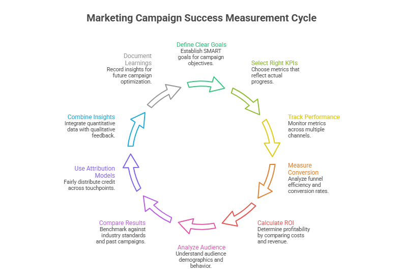 You measure the success of a marketing campaign by aligning clear goals with relevant KPIs, tracking performance across channels, evaluating conversions and ROI, analyzing audience quality, and comparing results to benchmarks. True success is defined not just by numbers, but by how effectively the campaign drives meaningful business outcomes.