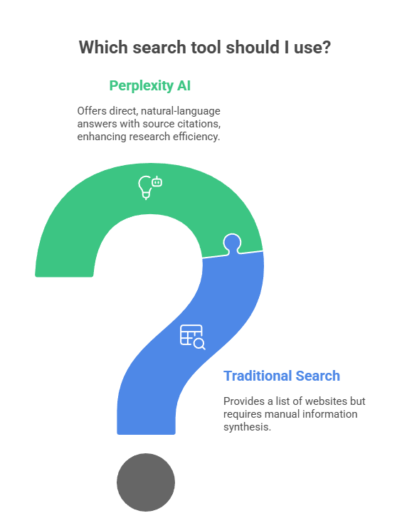 Rather than competing directly, Perplexity AI and traditional search engines function best as complementary tools. Each addresses different stages of the information-seeking process and supports distinct user goals. Together, they create a more complete and flexible research workflow.