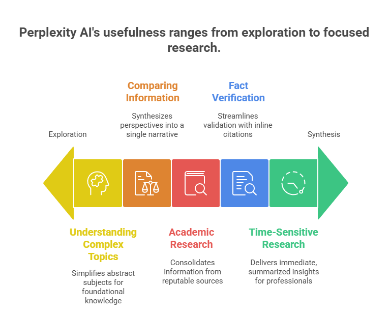 Perplexity AI is ideal for obtaining quick, high-level understanding or answering specific questions efficiently. Users can establish context and direction before engaging in deeper exploration.