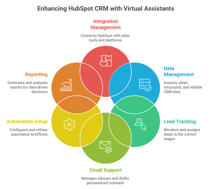 Virtual assistants handle integrations between HubSpot and tools like Gmail, Outlook, and third-party platforms. They ensure data flows smoothly across systems, troubleshoot sync issues, and maintain consistent performance. This improves overall productivity and allows teams to work more efficiently across multiple tools.
