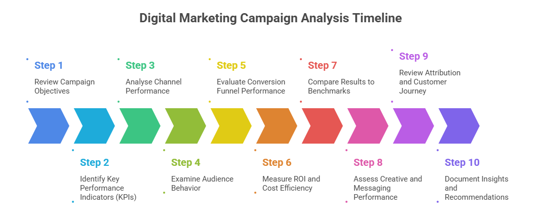 Analysing a digital marketing campaign requires a structured, step-by-step approach that evaluates performance from strategy through execution and outcomes. The process involves reviewing objectives, selecting the right KPIs, analysing channels and audiences, measuring conversions and ROI, and documenting insights for optimization. Steps 1 through 10 collectively provide a comprehensive framework to assess campaign effectiveness, identify gaps, and improve future digital marketing performance.