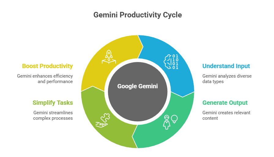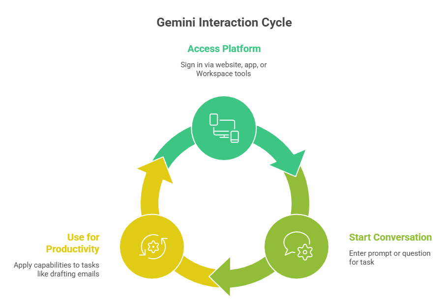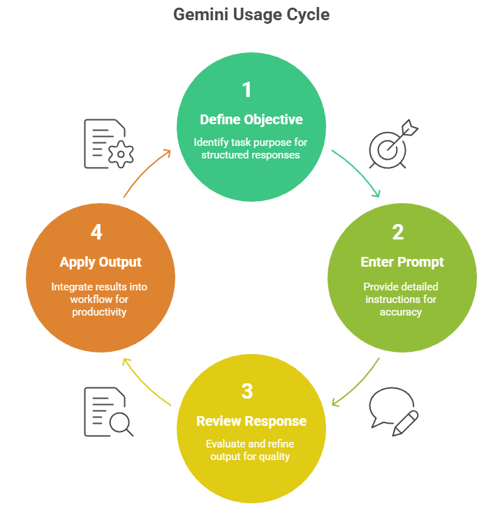 Before understanding how Gemini improves productivity and creativity, it is important to see how the platform functions step-by-step. Each stage of the interaction process helps refine responses, enhance task execution, and ensure relevance based on user intent. This structured workflow allows Gemini to deliver accurate, contextual, and actionable results across multiple use scenarios.