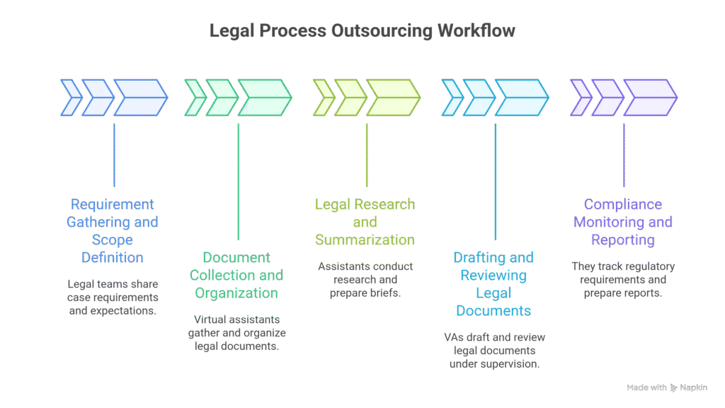 Legal outsourcing follows a systematic workflow designed to ensure accuracy, confidentiality, and compliance across all legal operations. Virtual assistants support nearly every stage of this process.