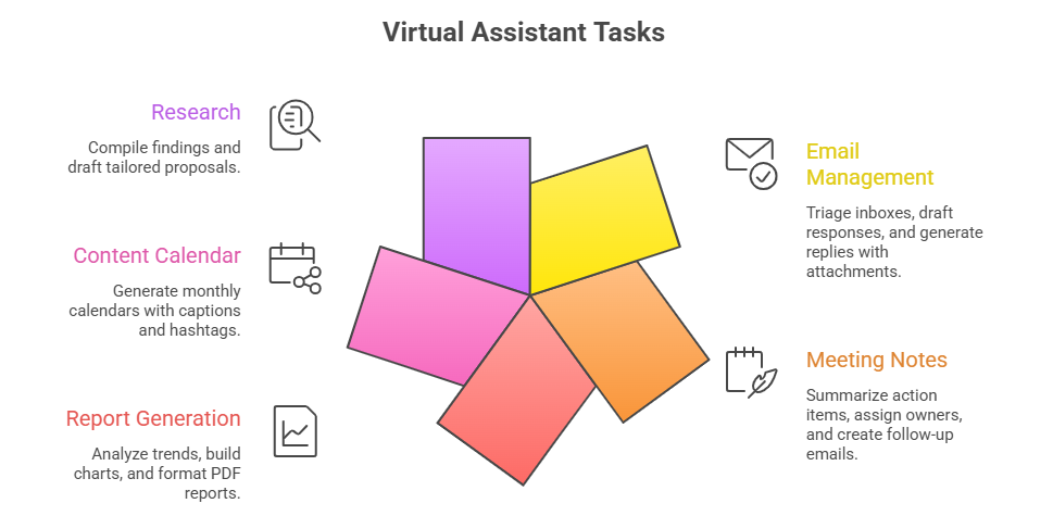 The app builds task sequences, calendars, or SOPs from natural language. VAs input client goals and receive step-by-step plans with deadlines. It scales operations by turning vague requests into repeatable processes, reducing miscommunication.