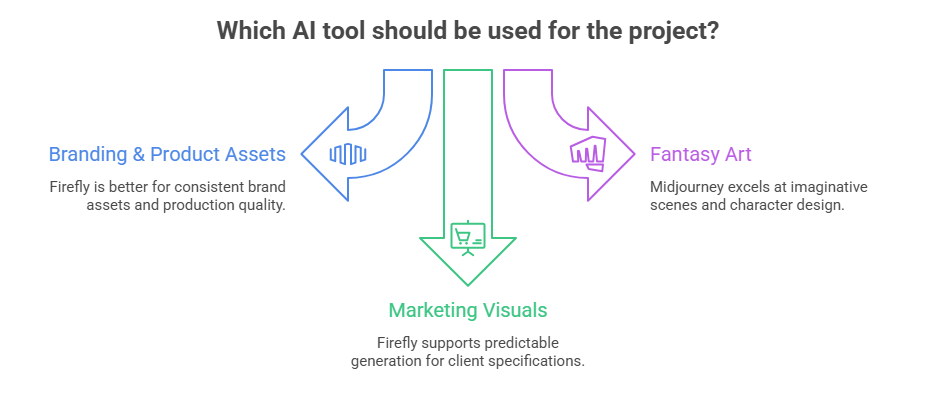 Yes — use Midjourney for inspiration and Firefly for design-ready final assets.