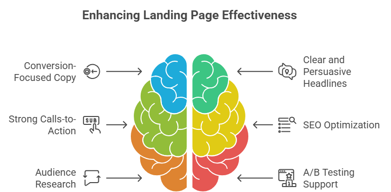 Landing Page Copywriting Services help businesses create compelling, persuasive, and conversion-focused copy for their landing pages. These services combine marketing expertise, SEO strategies, and psychological triggers to engage visitors, drive action, and maximize conversion rates.