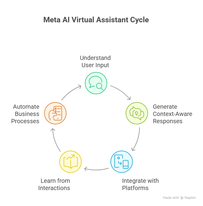 The Meta AI Virtual Assistant operates through a combination of language intelligence, platform integration, and automation logic. Its design enables it to understand user input, generate context-aware responses, and execute predefined workflows. These capabilities allow it to function efficiently across both personal and business use cases.