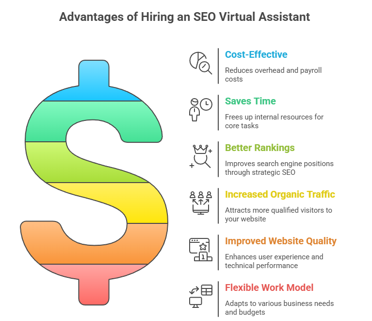 Hiring an SEO Virtual Assistant provides significant advantages for businesses seeking efficient and cost-effective optimization support. These professionals help streamline your SEO operations while improving search visibility. Below are the core benefits they deliver.