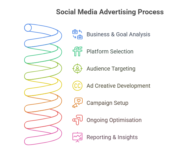 Before launching any successful paid social campaign, a structured and methodical process is required to ensure advertising spend delivers consistent returns. Each stage plays a critical role in aligning business objectives with platform capabilities, audience intent, and creative execution. The following steps outline how professional Social Media Advertising Services operate for UK-based businesses.