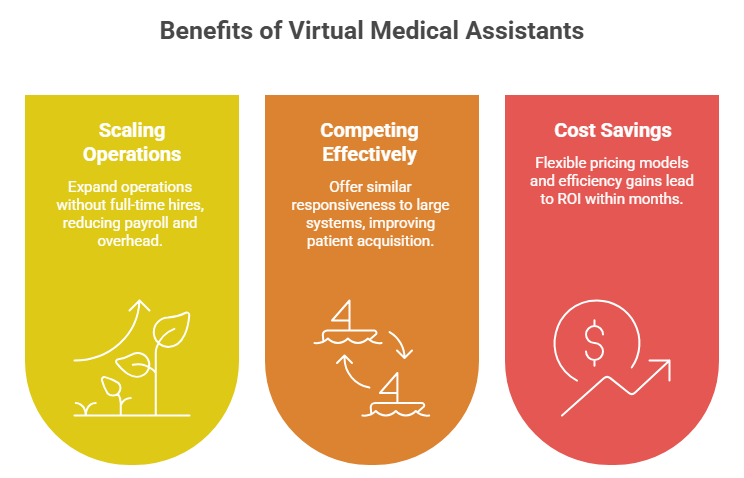 Virtual assistants significantly reduce costs compared to hiring in-house staff with salaries and benefits. Clinics can save between 30–60% depending on service models. This flexibility allows practices to scale without long-term financial commitments.