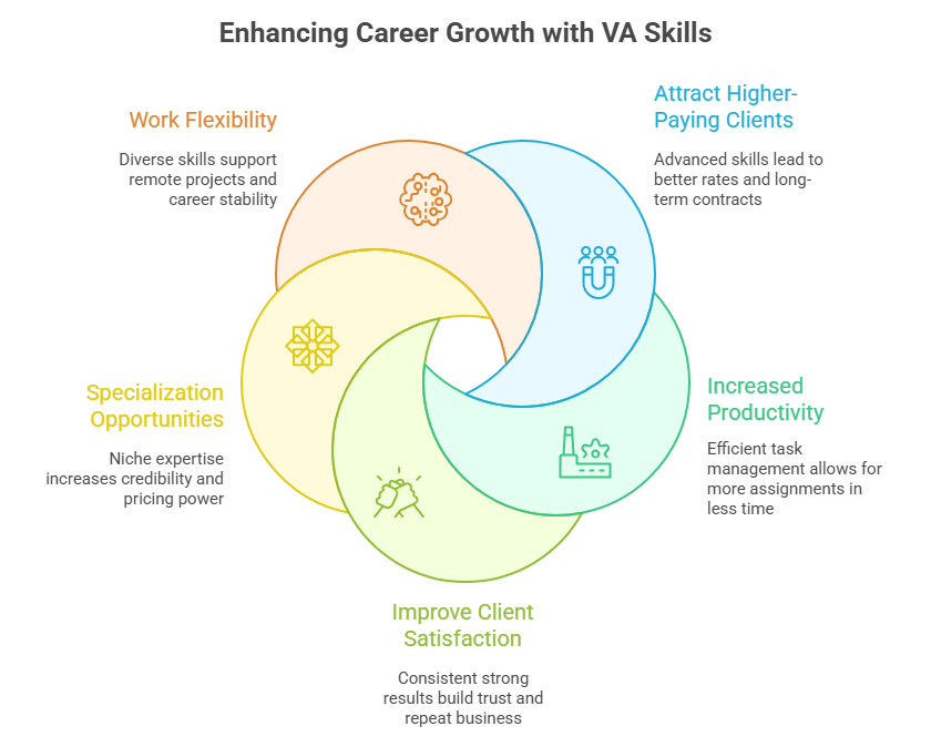 Developing strong VA skills unlocks multiple advantages that help professionals grow their careers. These benefits support client relationships, job performance, and earning potential. With the right skills, a VA can stand out among competitors and deliver lasting value.