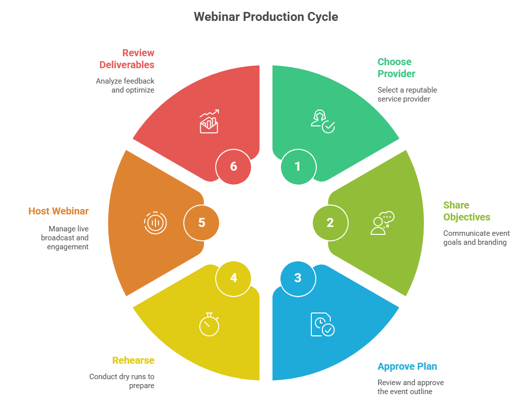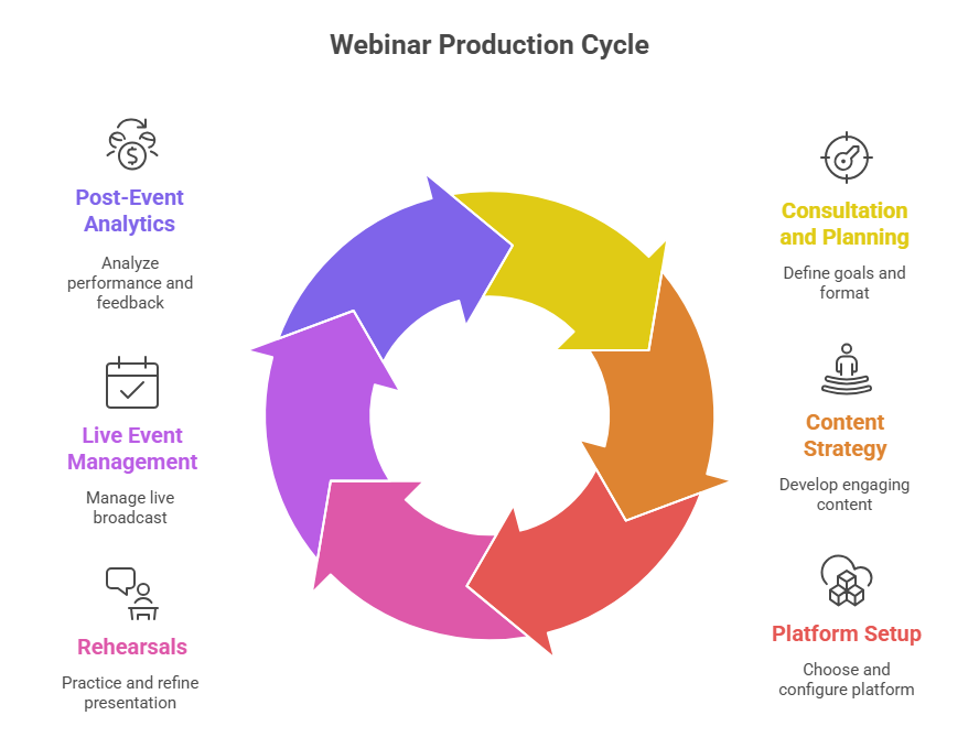 Before diving into execution, webinar production services follow a structured workflow that ensures every element is well-planned and flawlessly delivered. From understanding your goals to managing live sessions, each phase is crafted to align with your business objectives. Below are the six main stages that define how these services operate.