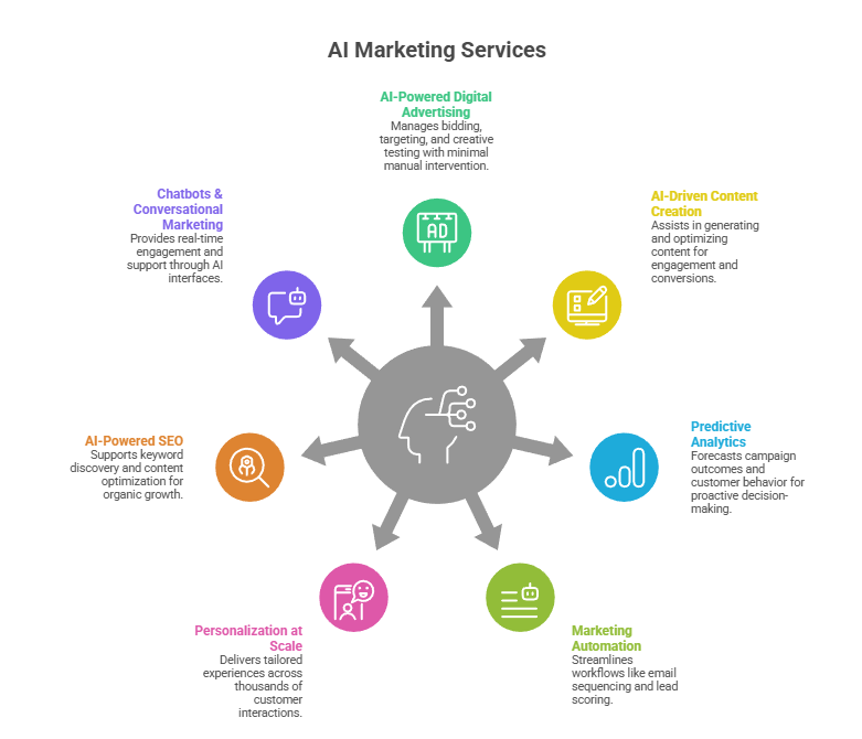 Most AI marketing agencies provide a comprehensive set of services that mirror traditional digital marketing, but with AI embedded at every stage. These services are structured to improve efficiency, accuracy, and scalability across channels.