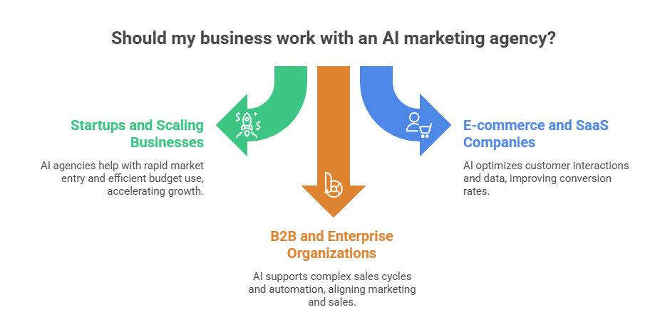 Startups and growing companies often need rapid market entry and efficient use of limited budgets. AI marketing agencies help these organizations test, optimize, and scale campaigns quickly using data-driven insights. This approach reduces risk while accelerating growth and learning cycles.
