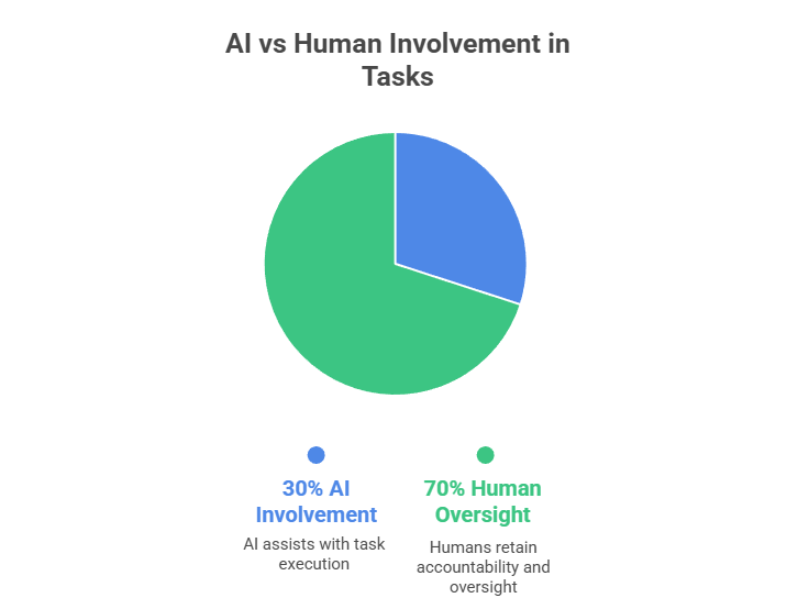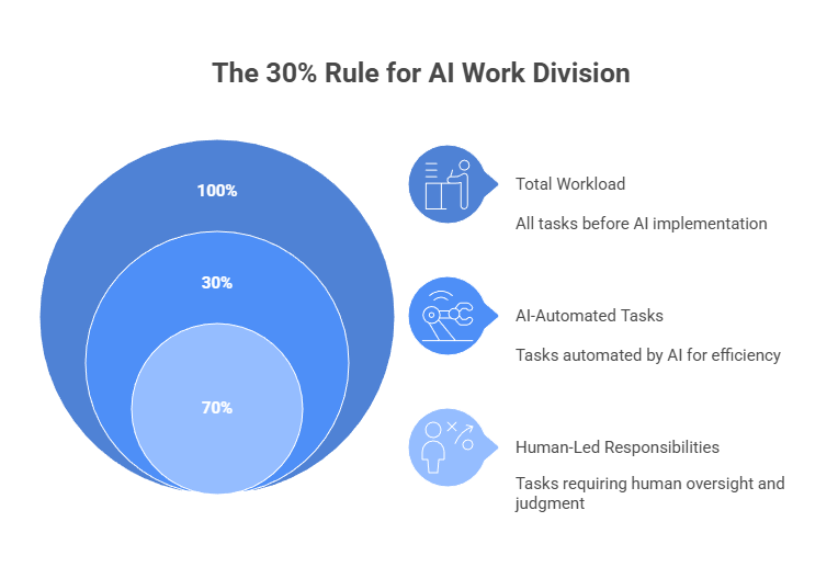 The 30% Rule operates by dividing work between automation-ready tasks and human-led responsibilities. AI is applied where it improves efficiency and speed, while humans remain responsible for strategic, ethical, and judgment-based activities. This structured division ensures that productivity gains do not come at the expense of accuracy, quality, or accountability.