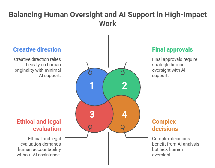 Humans remain responsible for high-impact work because these activities require context, accountability, emotional intelligence, and strategic judgment that AI cannot replicate. Decisions in these areas affect customers, brand trust, compliance, and long-term business outcomes, meaning they must be evaluated by people who understand nuance and real-world implications. In this model, AI functions as an assistant that informs decisions rather than a system that replaces human authority.