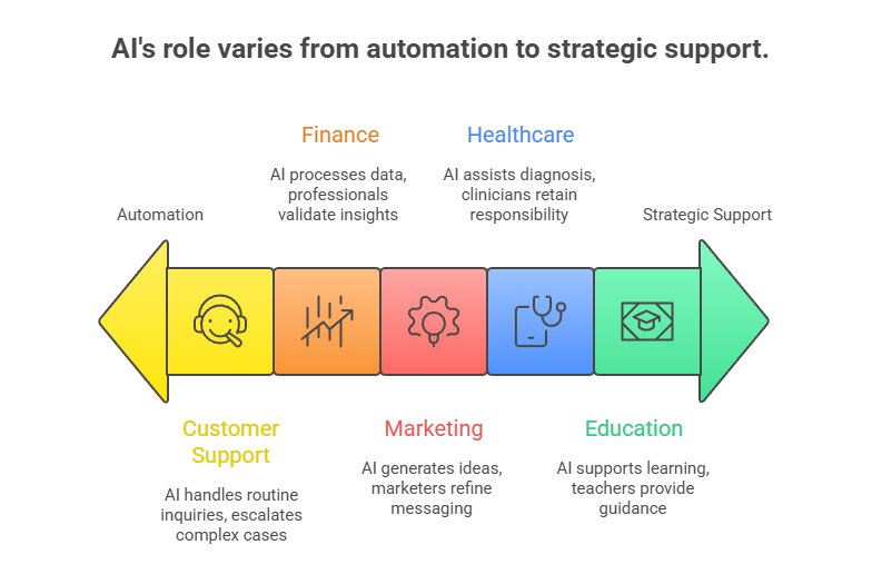 The 30% Rule adapts successfully across multiple industries by assigning AI to automation-ready tasks while preserving human oversight for strategic, ethical, and judgment-driven responsibilities. Organizations apply the guideline differently based on operational risk, compliance needs, and organizational priorities, allowing AI to support productivity without diminishing human authority or accountability.