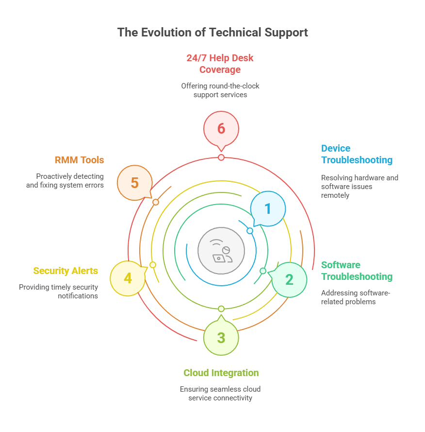 Remote technical assistance provides real-time solutions for device issues, software troubleshooting, cloud integration, and security alerts. For example, Remote Monitoring & Management (RMM) tools can proactively detect and fix system errors, reducing downtime by up to 40%. Companies can also benefit from 24/7 help desk coverage without needing to staff full-time local support teams.