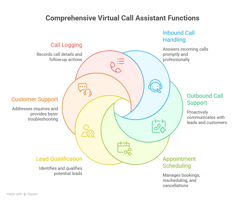 A Virtual Call Assistant is a remote professional who manages inbound and outbound calls for businesses. They handle tasks such as answering calls, appointment scheduling, lead qualification, customer support, and call follow-ups. By outsourcing call handling, businesses improve response times, reduce costs, and ensure no opportunity or customer inquiry is missed.